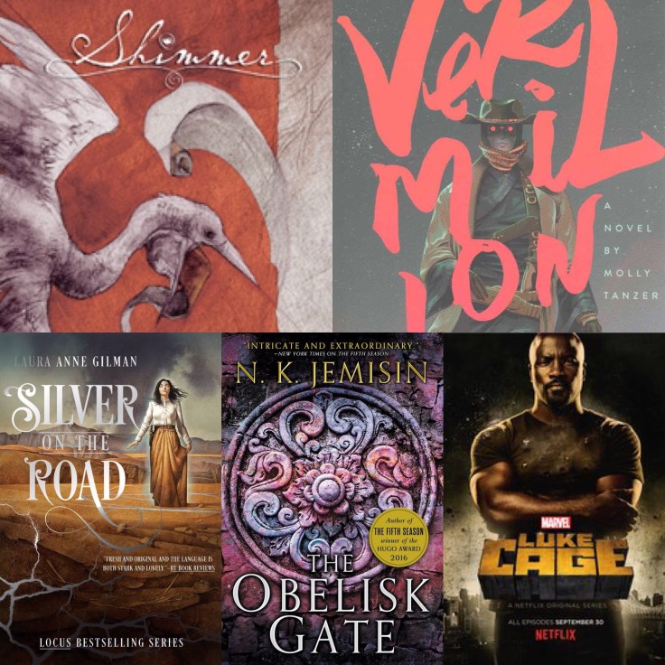 Speaking of novels and novellas, some recent reads have included Vermilion, which I have been wanting to read forever, and Silver on the Road. I guess I’ve been on a Western kick. Vermilion is set in San Francisco and other areas on the far west coast, during the 1800s unless I miss my guess. It is a steampunk adventure which skillfully tackles issues of Chinese immigration and labor in the rail industry, as well as gender fluidity and diverse sexualities. Silver on the Road is also an alternate West story, but set in the area between the Spanish territories and the Mississippi River following the successful bid by the American colonies for independence. The main character is a Latina woman who works for the devil, who runs a saloon in the town of Flood.