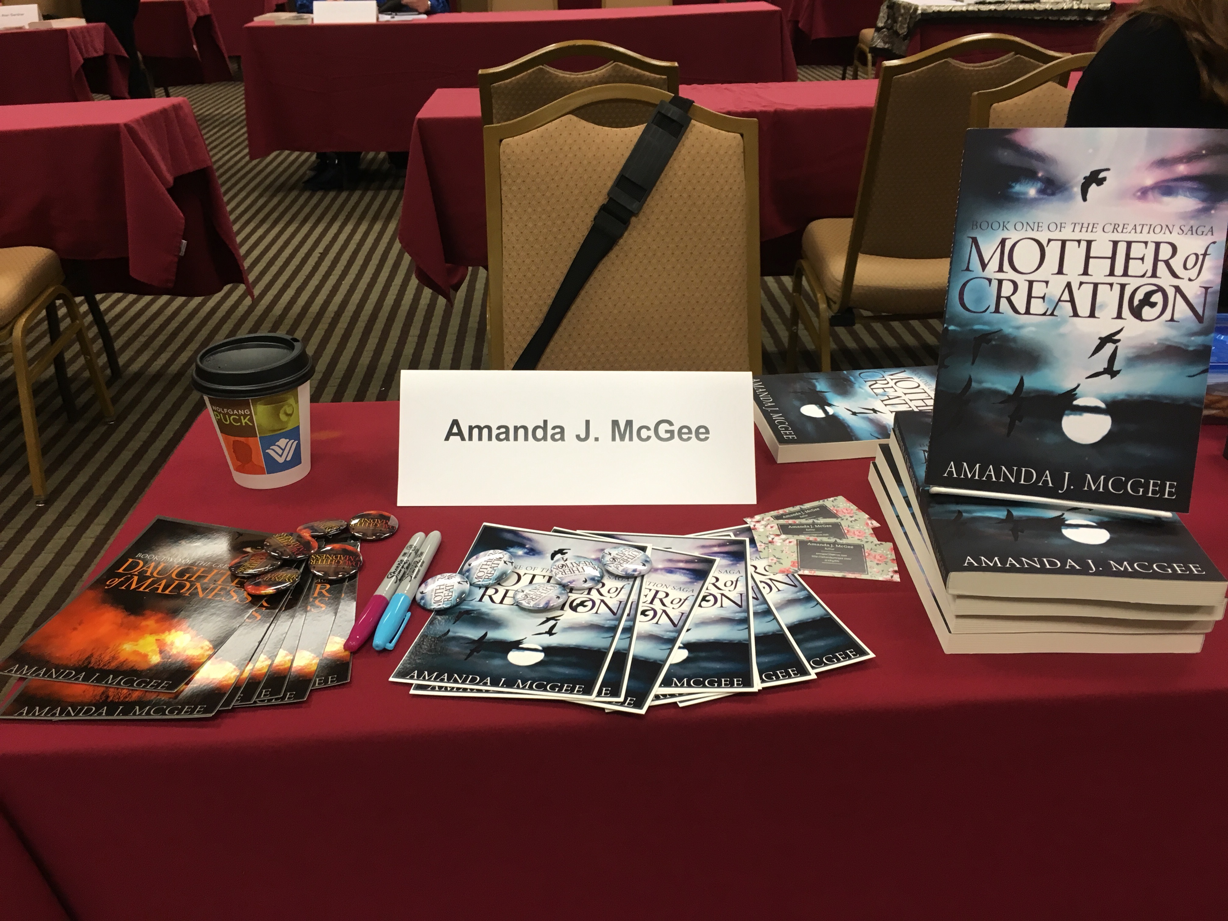 Friday night was the big book signing, so after a quick dinner we hurried back for setup. I had a small pile of books to sell, and I happily sold five of my six! I think people didn’t want to take my last copy.