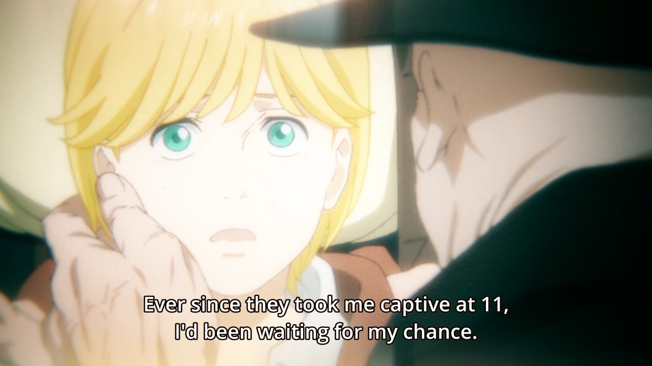 I mentioned that Ash, the lead in Banana Fish, is a character who is marked by betrayal. Specifically, Ash was kidnapped and made into a sex slave at a very young age. It is obvious that these sex acts are not a source of pleasure for him. They are something he has had to do to survive, just as Mio has. But as viewers, though we are clear that Ash has had these experiences – continues to have these experiences, even, throughout the narrative of the story – we don’t see the assault directly until the final arc of the anime. This is simply a thing that has happened to Ash. It is part of who he is, but it doesn’t rule him. Ash kills or outlives everyone who took from him in this way, though in the final arc we see that he cannot fully escape his past and his legacy of violence except in death.