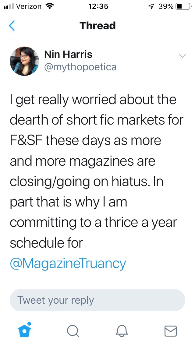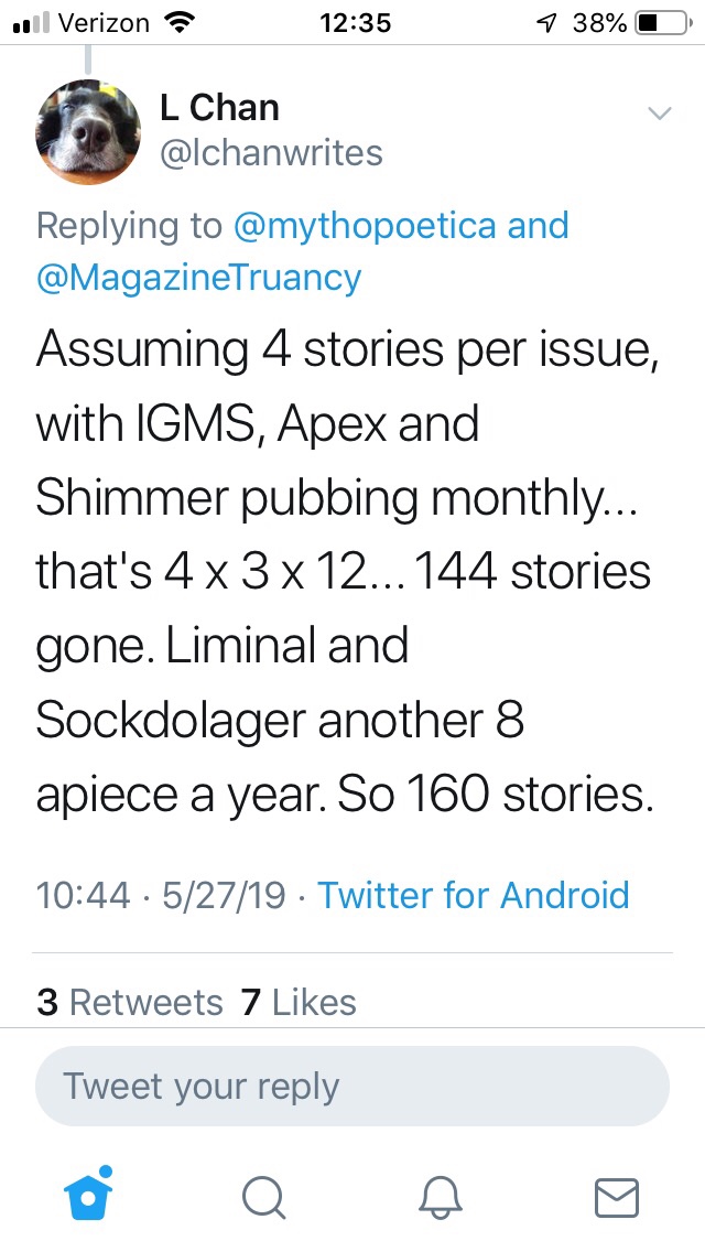 A little over a month ago I stumbled on this thread and posted some reflections on it in my Instagram stories. There’s a broader conversation going on right now about magazines and markets, many of which run at a loss or run as not-for-profit businesses. Short story markets can therefore be read as a labor of love, primarily (though I’m sure there are some exceptions). As markets close, the industry becomes even more competitive. And markets have closed this year. It’s fair to say that acceptance rates for an individual market will be affected by these broader market changes. More writers will flock to a more concentrated selection of venues to showcase their work.