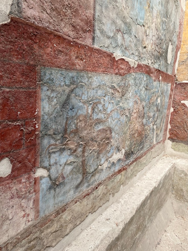 On either side of the straight streets, raised sidewalks offer refuge from the ghost of carts past. At intersections, large stones form crosswalks, gaps carefully calculated to allow those carts passage. Some streets are obviously pedestrian only — an ancient concept made new again in American cities. Doorways open between the walls, some with raised lintels — shops, our guide explained, open in the day and closed at night by heavy wooden boards. Others open into courtyards hidden behind oversized metal doors — the residences of landowners, the layout reminding me a little of a traditional Chinese garden such as the one I toured through in Portland, Oregon. In the entrance, a wide pool to catch water, the memory of a skylight above. On the remaining walls, lead pipes climb — they had running water in these houses, and their mansions are more than one story, containing multiple rooms for sleeping and socializing. Ruined rooftop gardens catch the breeze outside of abandoned upstairs lounges.