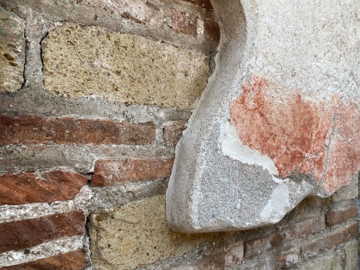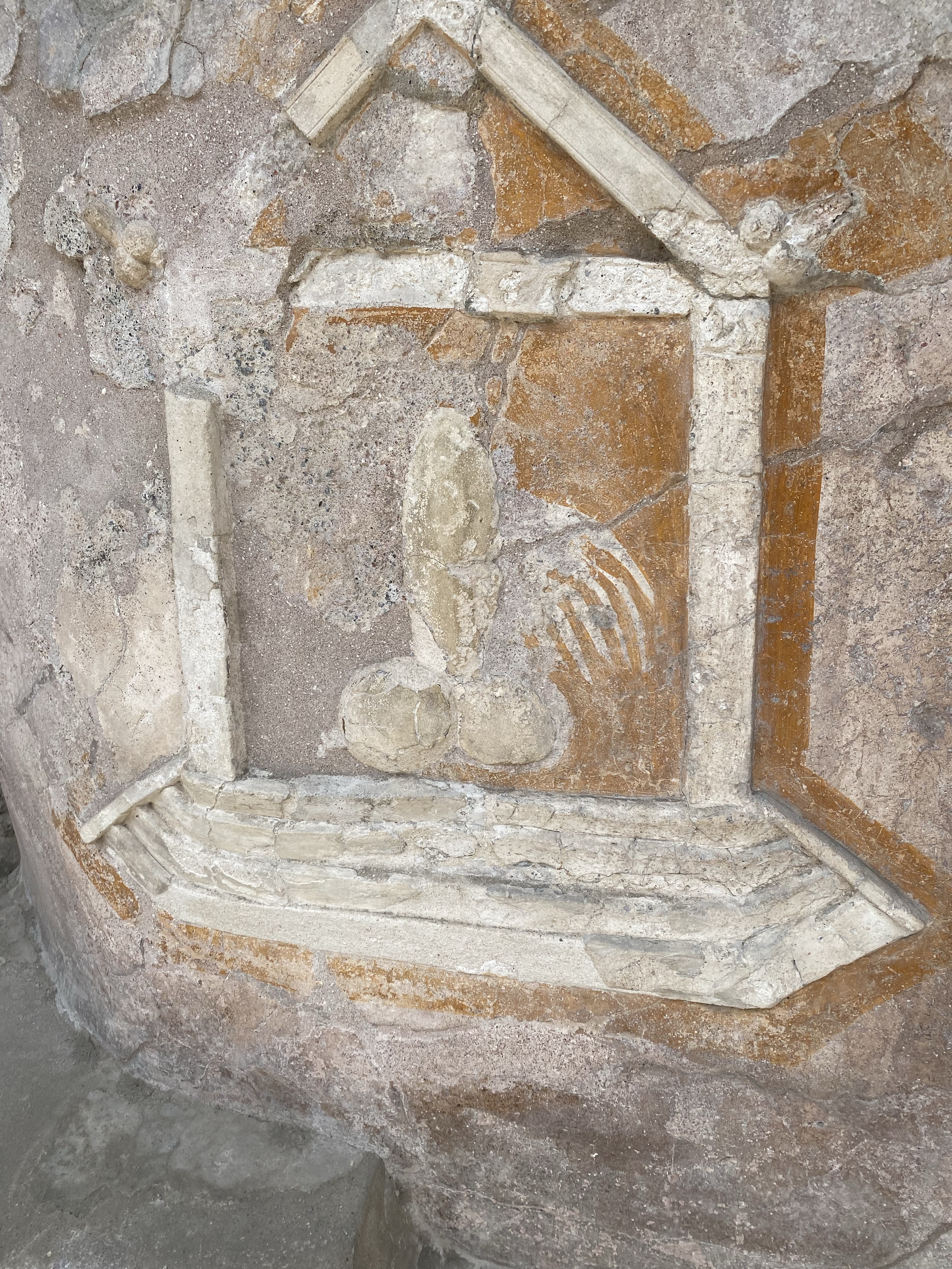Some of the shops are bakeries. Back when having fire in your house wasn’t necessarily a good thing, what with the dangers of property damage and the excess heat in an already hot climate, most people didn’t have big ovens. Some of the shops are lunch counters — the marble counters gleams still, where careful hands have cleaned them, and one can imagine oil lamps under the soup pots keeping them hot. Flaking advertisements painted on the walls show a snapshot of what may have been sold inside. Scraped graffiti like the letters carved into a bathroom stall sometimes dot these frescoes. The ancient faces of gods stare down on the street.