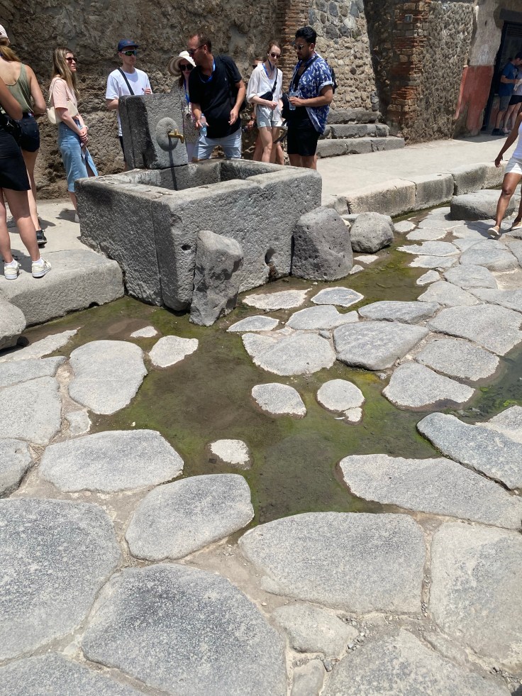 Pompeii is still a fragment of itself. Despite being amazingly well-preserved, it is a ruin. Most of the buildings lack roofs — crushed in by rock and debris, or damaged during excavation. But the streets are a marvel of engineering. The first thing you notice is the flat stone surface. In places it’s been filled back in so that there is no danger of tripping, though in others weather and erosion mean large gaps between the rocks that can catch a tired toe. Where the stone was softer or the road uneven you can still see the ruts of wagon wheels, worn there after centuries. Those wheels would have been made of wood, with an outer ring of iron. Did they repair the roads, replace the flat stones when they had worn down enough? Is that why some stones are flat and others gullied?