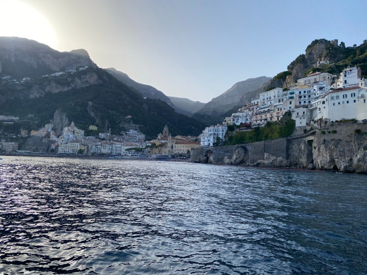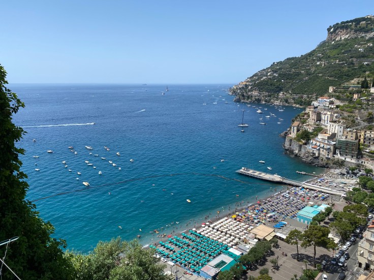 Near the top of our climb we came upon the first of the lemon-grower’s houses, open to provide refreshments. We drank fresh-squeezed lemonade and ate lemon salad — small sections of thick-rined lemon prepared with olive oil, vinegar and salt. It was surprisingly sweet. Then we continued our journey, tripping down the stairs to Maiori, where we met a friend for lunch before heading back to Minori for a shower and a nap.